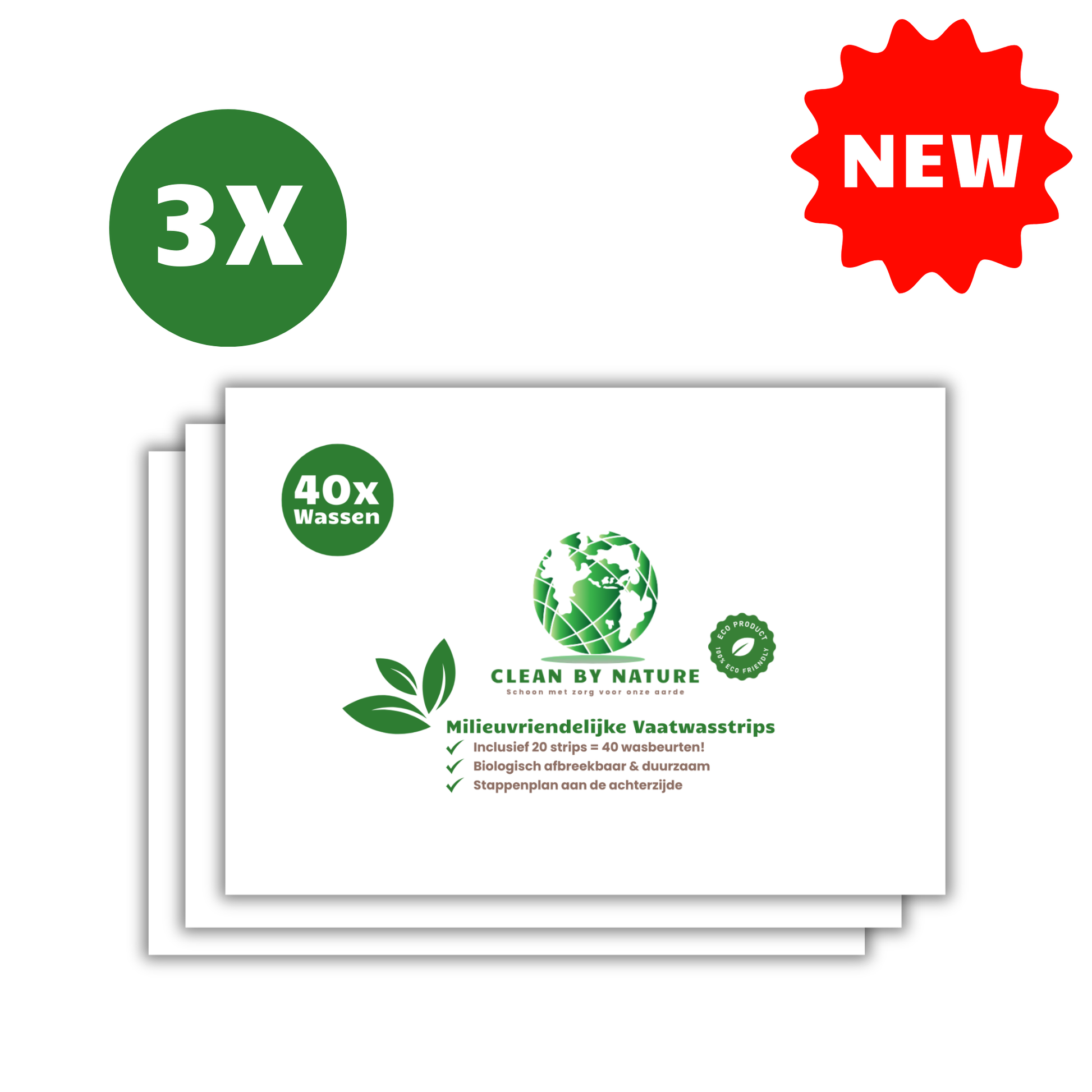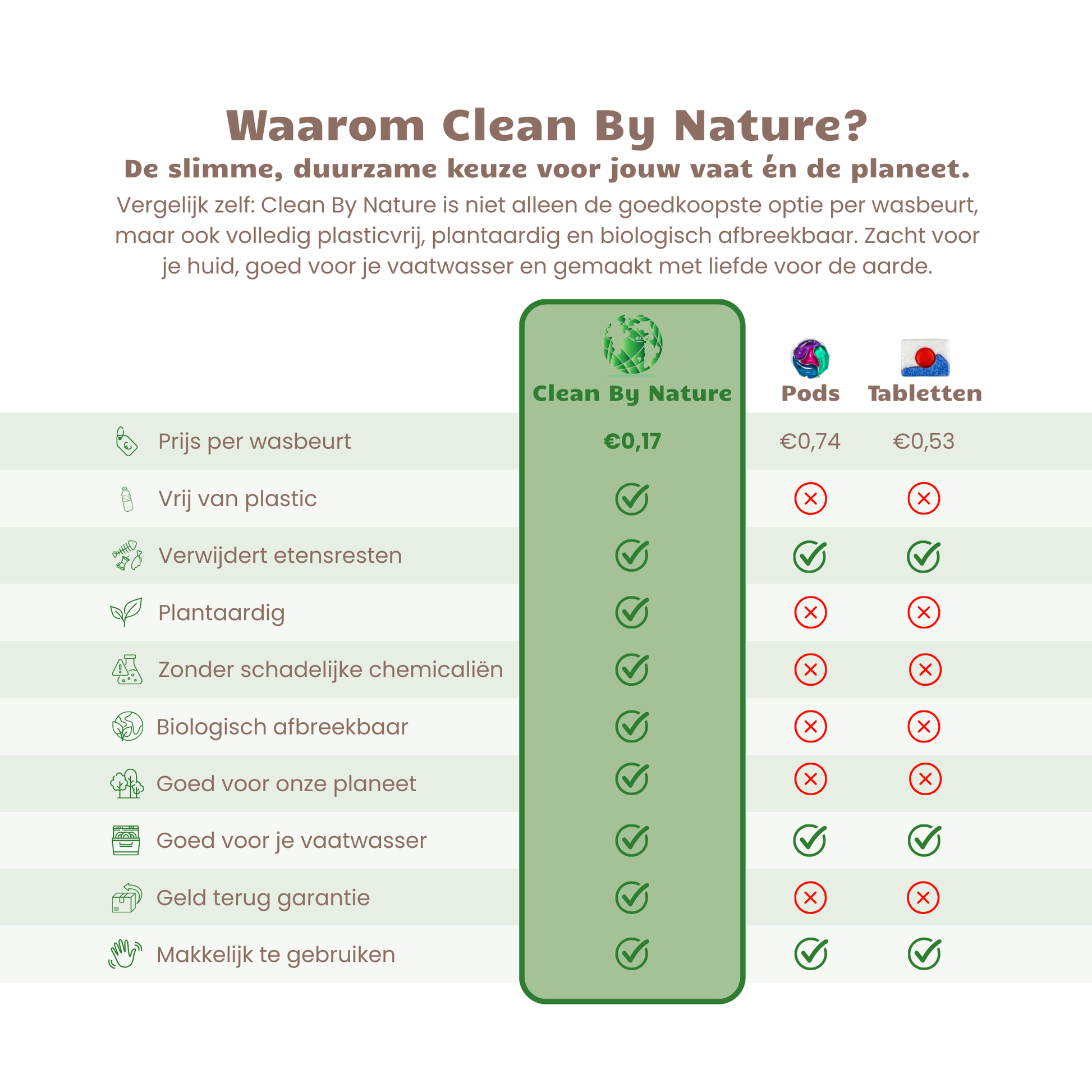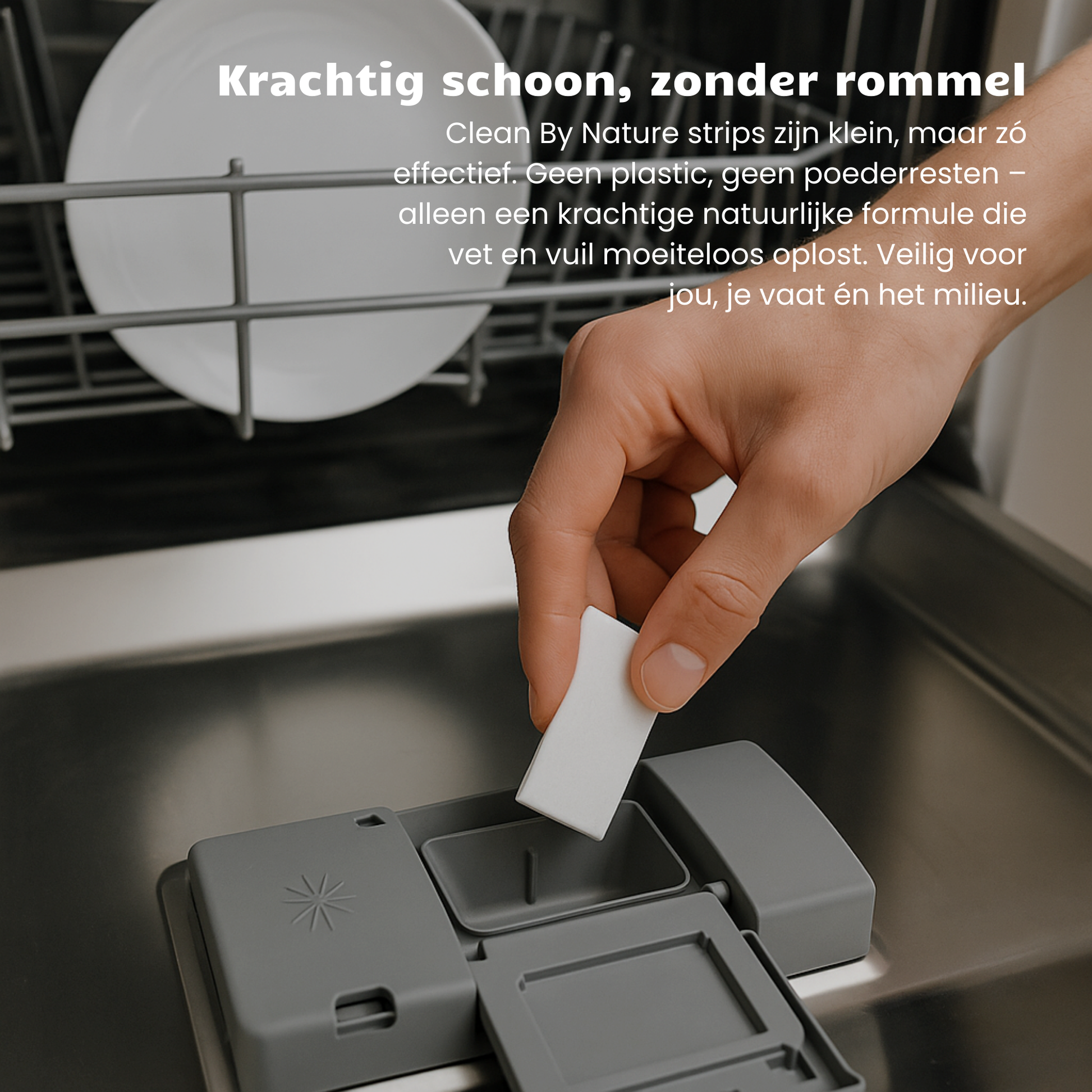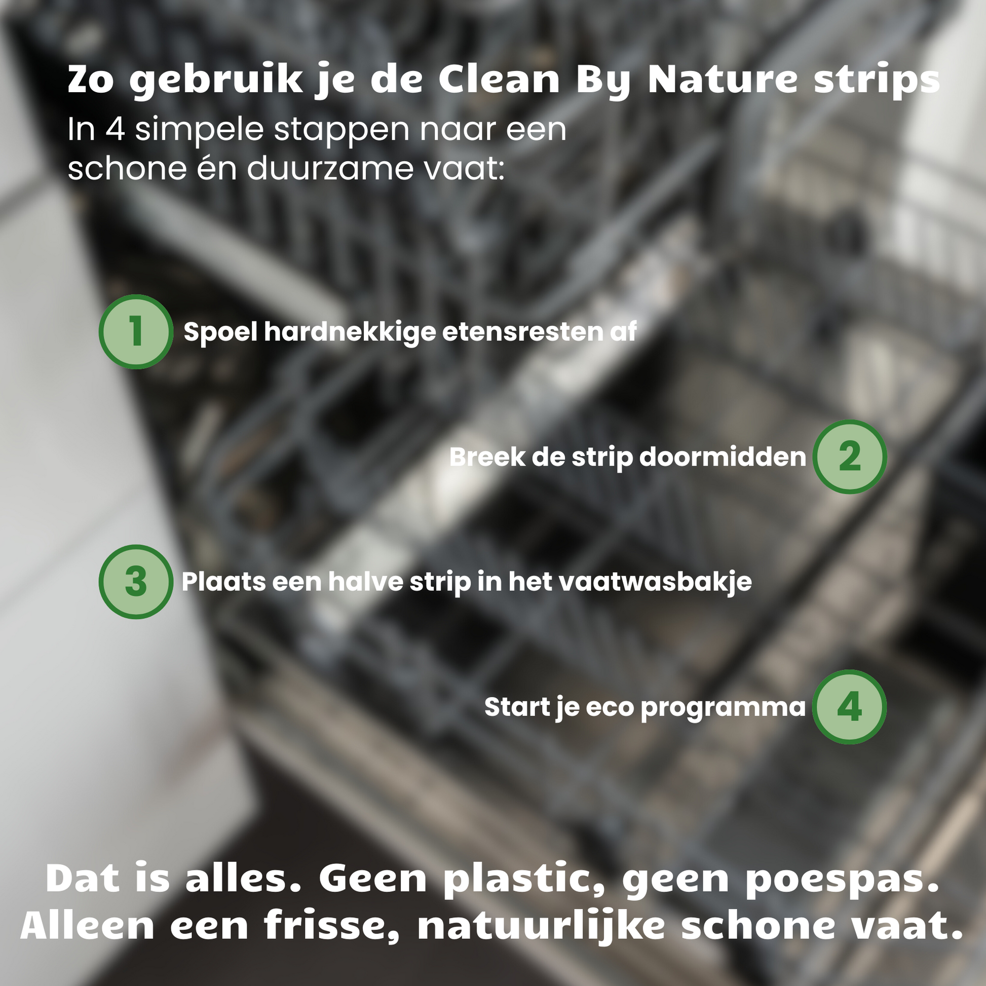 Met Clean By Nature kiest u voor eenvoud, effectiviteit en een schoon geweten. Onze natuurlijke vaatwasstrips zijn vrij van plastic, microplastics en onnodige chemicaliën – en lossen volledig op in uw vaatwasser.