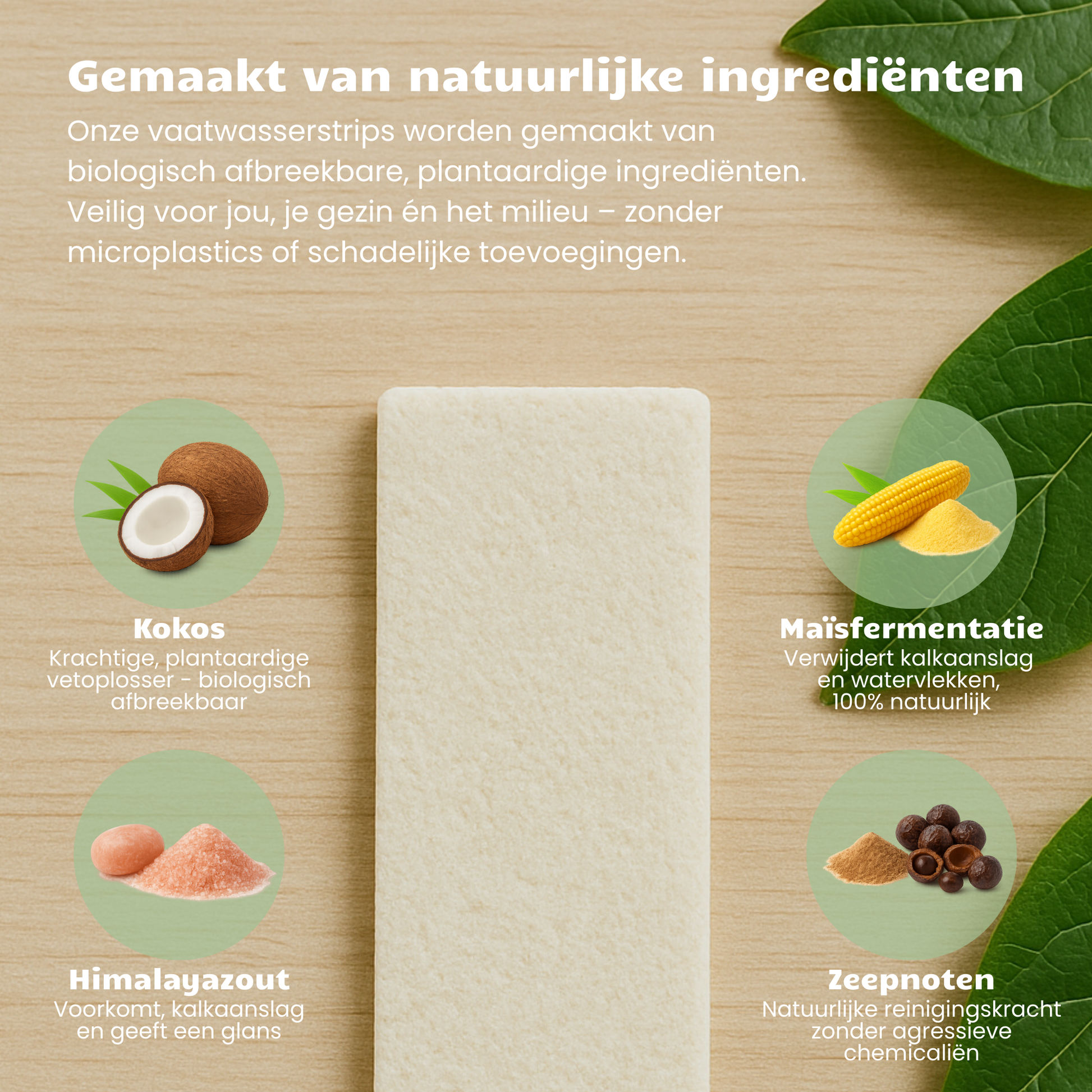 Een schone vaat, zonder vervuiling. Onze vaatwasstrips lossen volledig op, zonder plastic wikkels of microplastics. Ze zijn gemaakt van plantaardige ingrediënten en bevatten geen agressieve chemicaliën. Zo kiest u bij elke afwasbeurt voor een schoner huis én een gezondere planeet.